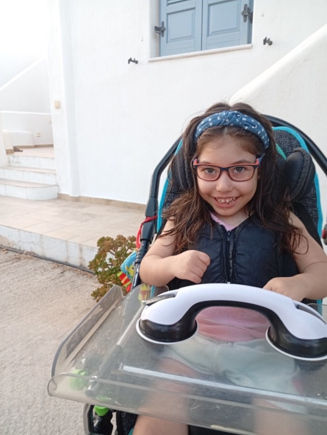 επιληπτικών κρίσεων και κινείται με αμαξίδιο· δεν ακούει και σιτίζεται με γαστροστομία. Φέτος είναι η δεύτερη χρονιά της σχολικής της πορείας στο ειδικό νηπιαγωγείο Νάξου· μιας πορείας δύσκολης και γεμάτης εμπόδια θεσμικά και ανθρώπινα.
